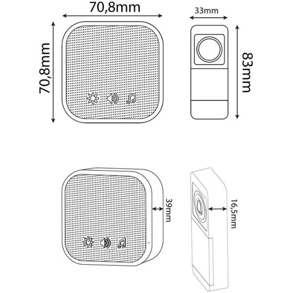 Dosah signálu mezi zvonkem a tlačítkem je v ideálním prostředí až 150m. V reálu záleží na konkrétním umístění, kdy překážky jako jsou stěny, beton, kov a podobně samozřejmě snižují dosah signálu. Bezdrátový zvonek pracuje na frekvenci 433,92 MHz.