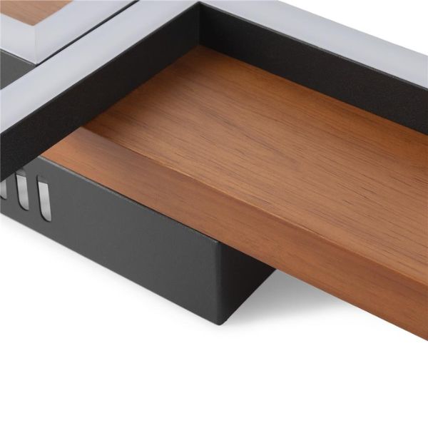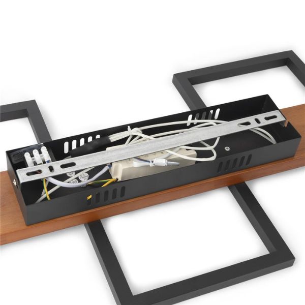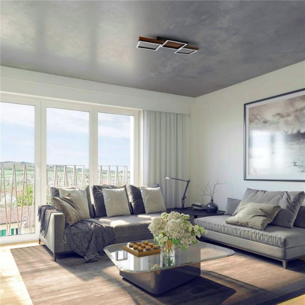 Designové LED stropní svítidlo Harper 3 je s délkou 65cm a šířkou 34,5cm originálním velkým stropním nebo nástěnným led svítidlem německé značky AVIDE. Na lakované desce ze světle hnědého dřeva (viz detail ve fotogalerii) jsou připevněny 3 čtverce z hliníku práškově lakovaného na černý mat. V nich jsou umístěny LED světelné zdroje překryté silikonovým mléčně zabarveným difuzorem. Díky němu lustr příliš neoslňuje ani při pohledu směrem nahoru.
