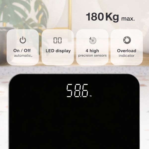 Horní plocha váhy je vyrobena z tvrzeného skla v kombinaci s nohami a tělem z odolného ABS plastu. Velký podsvícený LED displej 75 × 31 mm zajišťuje snadnou čitelnost hodnot i za horších světelných podmínek. Zaoblené rohy zvyšují bezpečnost při používání.