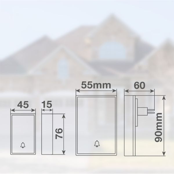 Rozměry bezbateriového zvonkového tlačítka: výška 7,6cm, šířka 4,5cm, hloubka 2,1cm.