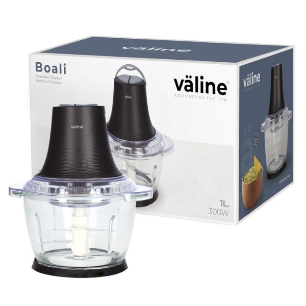 Elektrický sekáček Väline Boali pro domácí použití má motor o příkonu 300W a disponuje dvěma rychlostmi a 1 l nádobou z varného skla.