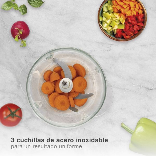 Elektrický sekáček má čtyřkřídlovou čepel z nerezové oceli, kdy každý z nožů je umístěn v jiné výšce. Díky tomu nože pokrývají celou dolní polovinu litrové nádoby. Příslušenství je odnímatelné, což výrazně usnadňuje mytí. Horní část sekáčku s mixérem má protiskluzový design. Na jejím vrcholu je výklopné ucho pro snadné přenášení. Napájecí kabel černé barvy má délku 80cm.