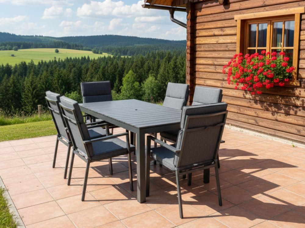Hliníkový zahradní nábytek - zahradní stůl Jerry je ideální volbou pro venkovní stolování na zahradě, terase či u bazénu. K tomuto velkému obdélníkovému zahradnímu stolu se bez problému vejde 6 dospělých. Hliníkový zahradní nábytek je bezúdržbový a velmi odolný proti vlivům počasí - nemusíte se o něj starat, namísto toho, aby vás okrádal o čas, umožní vám příjemné a bezstarostné stolování na čerstvém vzduchu.