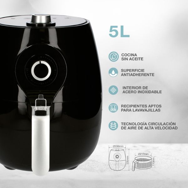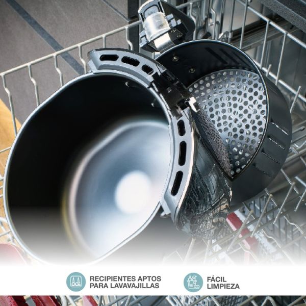 Horkovzdušná fritéza má podobu elegantního kompaktního hrnce. Z něj za studenou rukojeť vyjmete fritovací koš, který sestává ze dvou kruhových nádob s nepřilnavým povrchem. Hlavní nádoba, která tvoří vnitřní pečící prostor horkovzdušné fritézy, má průměr 23cm a je 12cm hluboká. V ní je vnořený fritovací koš s dírkovaným dnem, jímž stéká výpek z masa na dno koše bez toho, aby v něm maso leželo. Výpek pak snadno použijete na zalití masa na talíři. Průměr koše je 21cm, koš je 11cm hluboký. Pokud je to možné, doporučujeme používat pečící papír do horkovzdušné fritézy. Ušetří vám práci s čištěním koše.