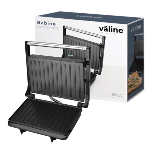 Domácí středně velký kontaktní gril Väline Babine, který ugriluje maso, zeleninu, sýr nebo zapeče tousty, panini apod. Ušetří Váš čas a energii a pomůže připravit chutné hlavní jídlo, snídani nebo svačinu.
