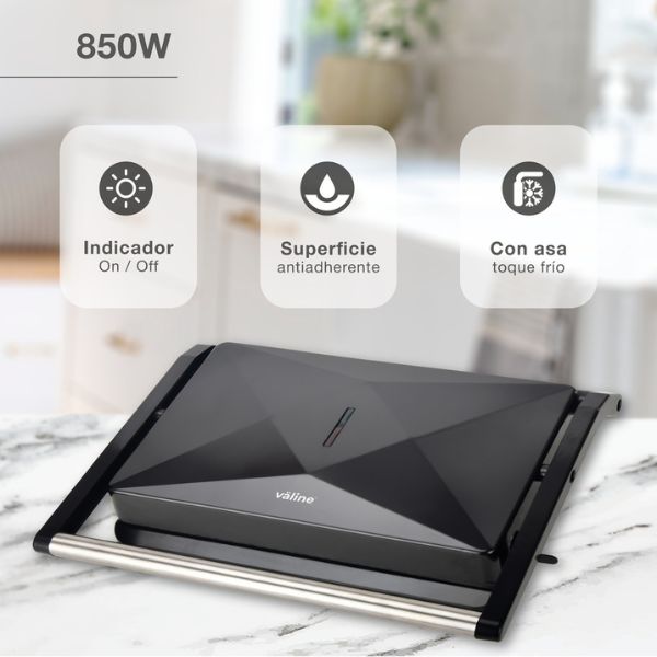Jednoduché intuitivní ovládání s automatickou kontrolou teploty. Plotýnky s nepřilnavým povrchem. Snadné čištění. Tepelně izolovaná rukojeť z hliníku. Protiskluzové nožičky. Maximální otevření horní vůči spodní části grilu je 90°.
