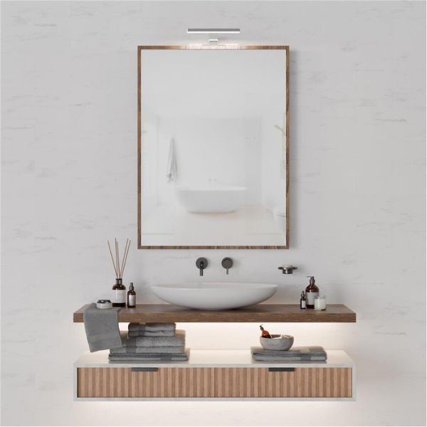 Koupelnové svítidlo nad zrcadlo se montuje na horní vodorovnou část zrcadla nebo skříňky. Součástí balení jsou dva vruty, k tomu určené. Instalace je rychlá a jednoduchá, což šetří váš čas i energii. Svítící plocha začíná 6cm od nohy svítidla a protože je 2,5cm široká, končí 8,5cm od nohy. O tyto míry bude svítidlo předsazené před zrcadlo, namontujete-li jej na okraj horní plochy zrcadla.
