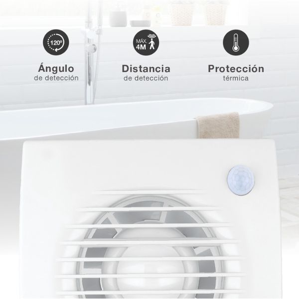 Tento koupelnový ventilátor se nepřipojuje k vypínači. Namísto toho má na čelním panelu integrované infračervené pohybové čidlo (PIR), které jej automaticky spouští pokaždé, když zaznamená pohyb v místnosti. Ventilátor bude zapnutý ještě po dobu 1 minuty po ukončení pohybu. Čidlo pohybu má dosah 4m, detekuje v úhlu 120° a aby byla jeho činnost optimální, je potřeba jej instalovat do výšky alespoň 2,3 m. Při instalaci větráku do koupelny je tedy potřeba brát v úvahu tyto okolnosti.