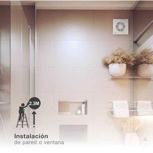 Ventilátor je vyroben z kvalitního ABS plastu v lesklé bílé barvě, která elegantně ladí s většinou koupelnových interiérů. Je určen pro montáž na stěnu nebo na strop, což umožňuje flexibilní umístění podle možností místnosti. Minimální výška instalace je 2,3m.