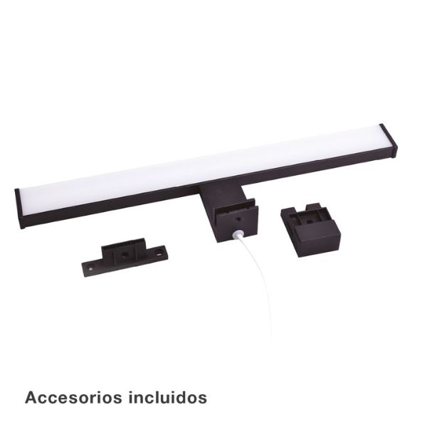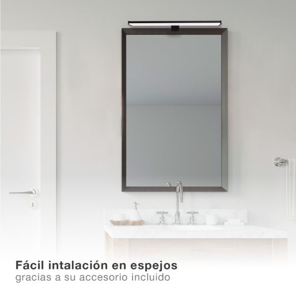 Koupelnové svítidlo nad zrcadlo můžete namontovat na horní vodorovnou část zrcadla nebo skříňky. Součástí balení jsou dva vruty, k tomu určené. Instalace je rychlá a jednoduchá, což šetří váš čas i energii. Svítící plocha začíná 5cm od nohy svítidla a protože je 4cm široká, končí 9cm od nohy. O tyto míry bude svítidlo předsazené před zrcadlo, namontujete-li jej na okraj horní plochy zrcadla.