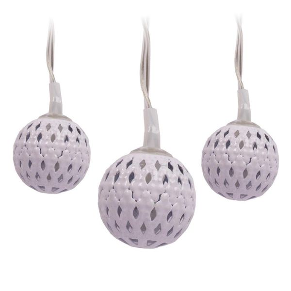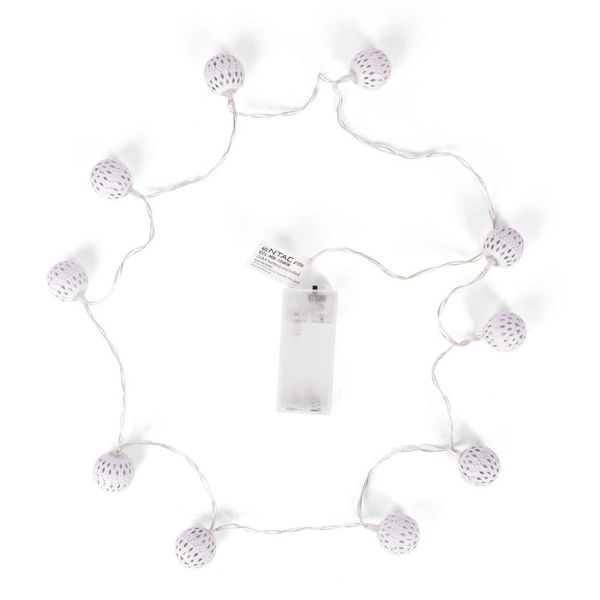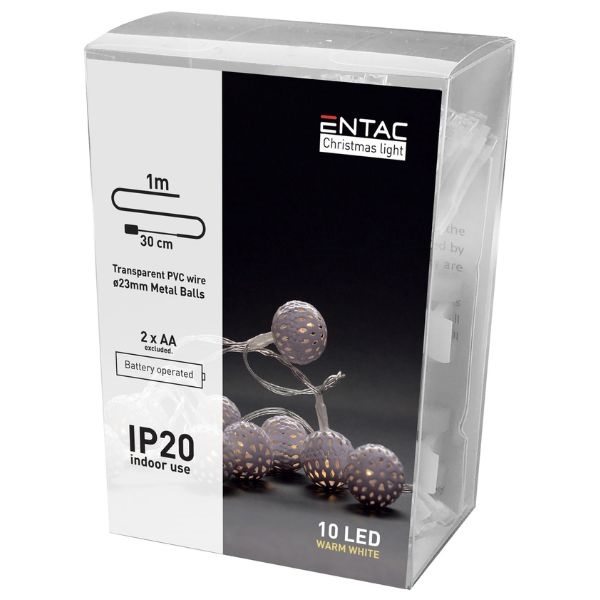 Elegantní vánoční řetěz sestává z 1m dlouhého průhledného kabelu s 10 ozdobnými bílými kovovými koulemi o velikosti 23mm, v nichž jsou umístěmy LED diody vydávající příjemné světlo pronikající otvory v kuličkách. Vánoční řetěz je ukončen přívodním kabelem o délce dalších 30cm, na jehož konci najdete průhlednou krabičku na 2 tužkové baterie a spínač, kterým vánoční řetěz rozsvítíte a zhasnete.