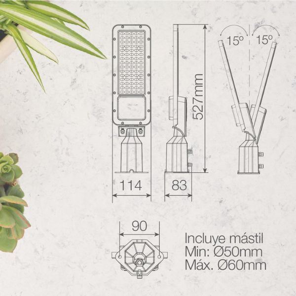 Toto LED pouliční osvětlení je na konci vybaveno dutou osmiúhelníkovou patkou s vnitřním průměrem 63 mm, kterou lze nasunout na stožár o průměru 50–60 mm. Patka má hloubku 90 mm. K upevnění slouží dva velké imbusové šrouby, které jsou součástí balení a pro které jsou v patce připravené závity.