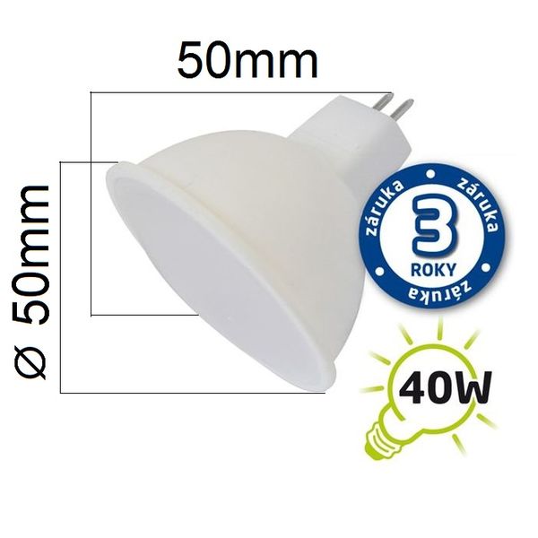 Vysoce úsporná LED žárovka bodovka za skvělou cenu. Jedná se o typ LED žárovky 12V AC/DC. Tyto SMD LED žárovky MR16/GU5.3 o výkonu pouze 5W svítí přibližně jako běžná žárovka o výkonu 40W - světelný tok je 400 lumenů.