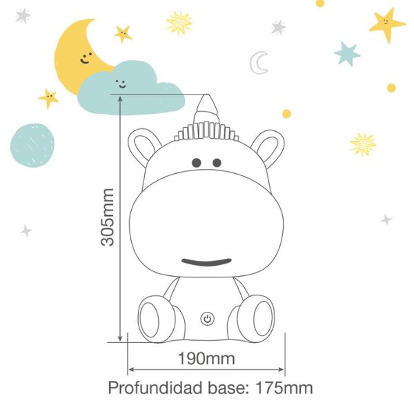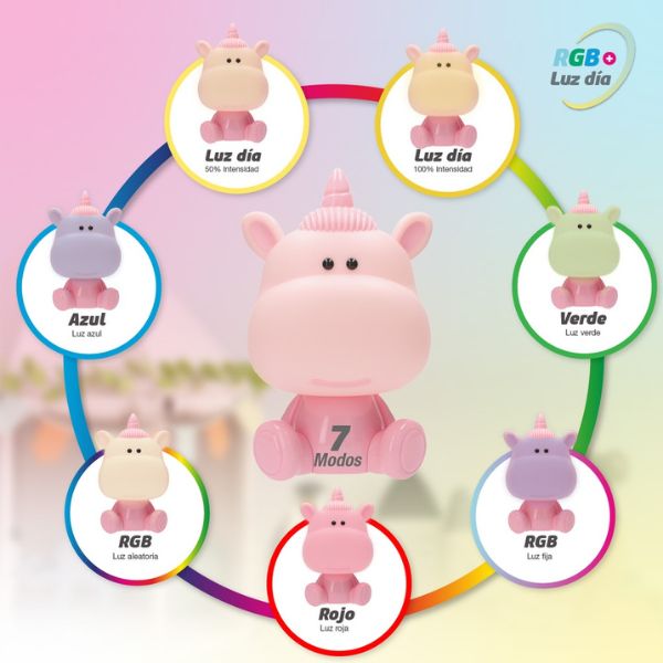 Jedná se o dekorativní noční světlo s nízkou intenzitou, ideální k usínání nebo jemnému orientačnímu osvětlení Není určeno pro čtení ani žádnou jinou činnost. Barvy světla jsou ovlivněny tím, že hlava jednorožce je růžová.