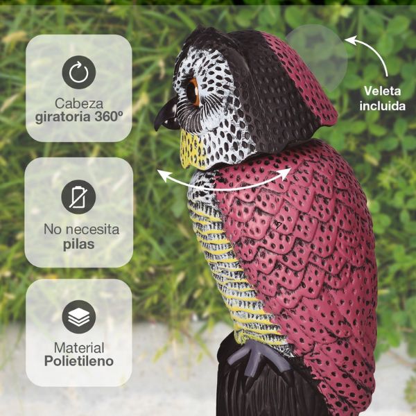Hlava sovy se kýve ve větru a otáčí se do stran v rozsahu 360°, čímž zvyšuje účinnost odstrašení. Pro ještě lepší pohyb se do zadní části sovy zasouvá lopatka z čirého plastu, která zajišťuje reakci i na slabý vítr. Provoz je zcela bezbateriový – o pohyb se zadarmo postará počasí.