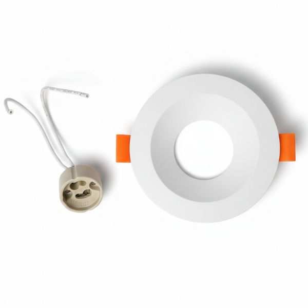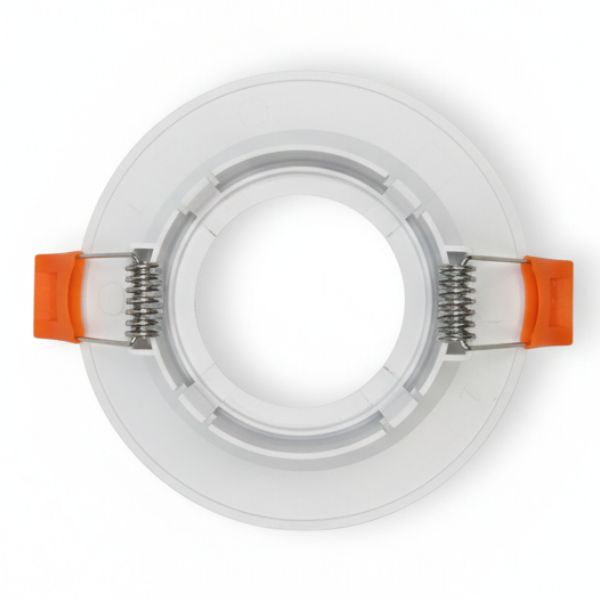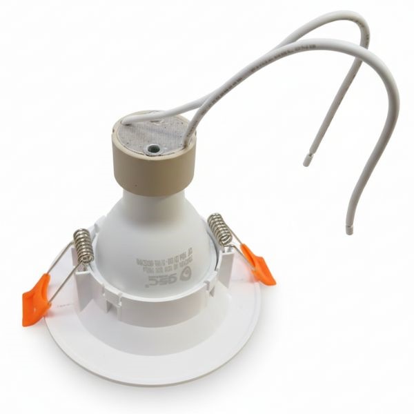 Do podhledu vyříznete kruhový otvor o průměru 70mm. Do zadní části podhledového rámečku, která bude později zapuštěna do podhledu, zatlačíte LED bodovkovou žárovku tak, že držáky zaklapnou a žárovka bude k rámečku napevno připevněna. Žárovku zasadíte do patice, jejíž vodiče připevníte k síti (součástí balení je patice pro LED bodovky GU10, můžete ji nahradit paticí MR16, kterou u nás můžete přikoupit). Po krajích bodovkového svítidla ohnete pružiny směrem nahoru a zasunete svítidlo do montážního otvoru. Pružiny se uvnitř podhledu narovnají a budou rámeček držet na svém místě. Bude-li potřeba vyměnit žárovku, vytáhnete rámeček ven z podhledu a po výměně žárovky jej opět zasunete zpět.