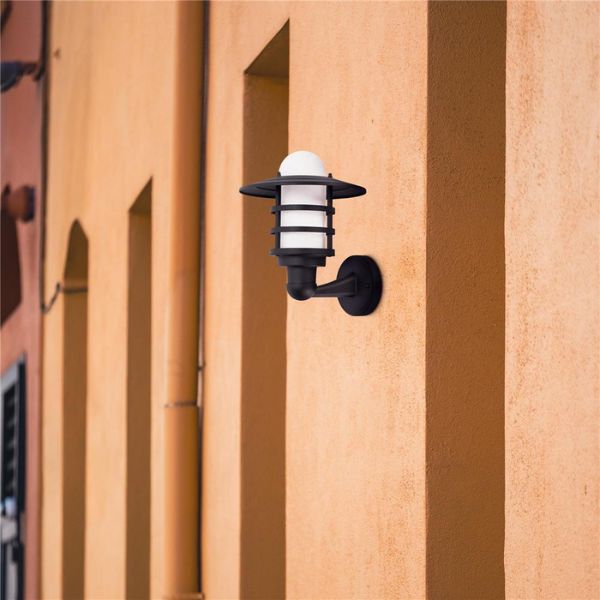 Toto venkovní svítidlo ve tvaru lucerny je perfektním řešením pro osvětlení vchodu do domu, pergoly, terasy, apod. Jedná se o kvalitní venkovní svítidlo jehož robustní tělo je vyrobeno z práškově lakovaného hliníku, který nikdy nezrezne. Narozdíl od levných plastových venkovních nástěnných svítidel, která působením venkovních podmínek, zejména slunečního záření, postupně křehnou, mění barvu a rozpadají se, tohle se Vám s tím naším opravdu nestane. Kryt žárovky je vyroben z mléčně zbarveného tlustého skla, které je zčásti chráněno hliníkovou konstrukcí svítidla. Díky mléčnému zabarvení skla Vás svit lampy neoslní. Kryt rozptyluje světlo nejen do stran, ale i směrem nahoru.