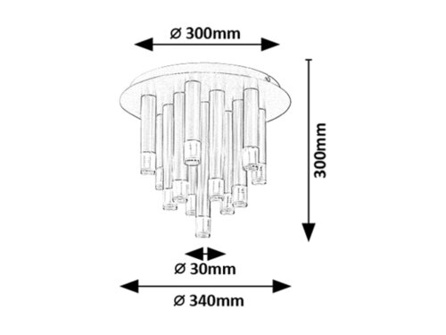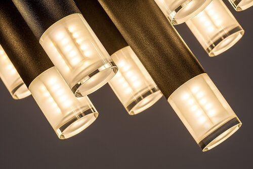 Rabalux Ramira stropní lampa je primárně doporučena pro ty, kteří hledají moderní lampu s unikátním vzhledem, kterou lze integrovat téměř do jakéhokoli prostoru jejich domova. Tento spektakulární model je vyroben z kovu v elegantní černé barvě. Lampa má transparentní akrylové stínidla, která doplňují hlavní světelné prvky. Lampa může být připevněna ke stropu pomocí velké kulaté dekorativní základny. Tento design je kombinován s válcovými lampovými prvky různých délek, připomínající rampouchy nebo ještě více, visící stalaktity. Stropní lampa je ideální pro obývací pokoj, kuchyň, jídelnu nebo ložnici. Může být použita s 13 žárovkami, každá s výkonem až 5 W. Typ patice je G9. Díky velkému počtu žárovek má lampa výraznou světelnou intenzitu. Je dodávána bez světelných zdrojů.
