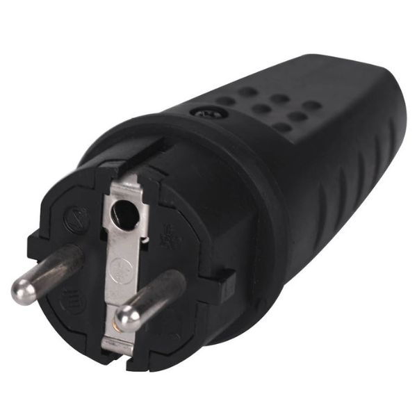 Samostatná zástrčka pro montáž ke vhodnému zařízení na 230 V nebo ke kabelu. Zástrčka je typu UNISCHUKO s uzemněním v drážkách po straně zástrčky. Ochrana IP44, voděodolné, lze používat i venku.