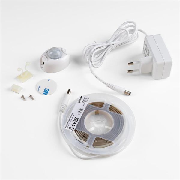 Jedná se o ucelenou sadu, která obsahuje 1m voděodolného led pásku se samolepící zadní stranou k přilepení na čistý, odmaštěný povrch. V případě potřeby lze led pásek zkrátit. Led pásek je ukončen konektorem, který připojíte do přiloženého prodlužovacího konektoru, jehož druhý konec zasunete do čidla pohybu. Do něj pak zapojíte trafo, které je též součástí dodávky. Infra čidlo připevníte pomocí oboustranné lepící pásky. Napájecí zdroj bílé barvy má příkon 12W, což je pro napájení tohoto led pásku více než dostatečné. Jedná se o napájecí zdroj do zásuvky, podobný nabíječce telefonu.