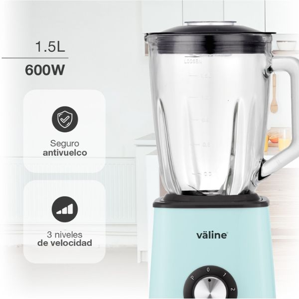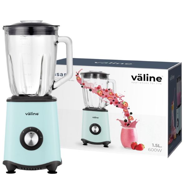 Elektrický stolní mixér Väline Kumsari pro domácí použití má motor o příkonu 600W a disponuje dvěma rychlostmi, pulzní funkcí, 1,5l nádobou z varného skla a měděným motorem.