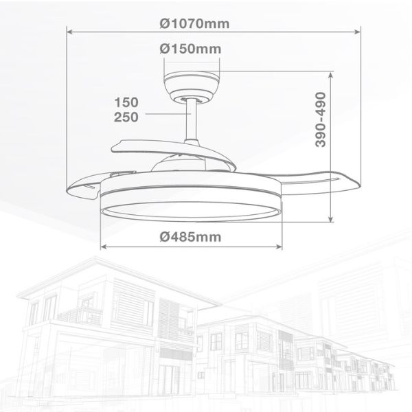 Součástí balení jsou dvě závěsné tyče (150 mm a 250 mm), díky nimž lze upravit vzdálenost ventilátoru od stropu na celkových 390 mm nebo 490mm.