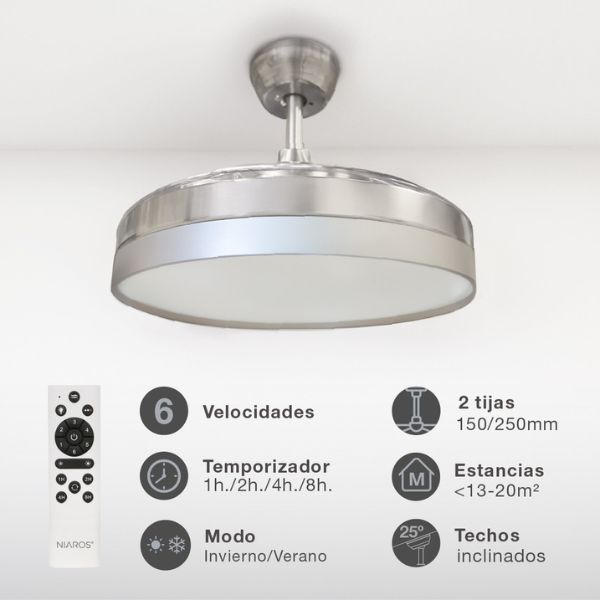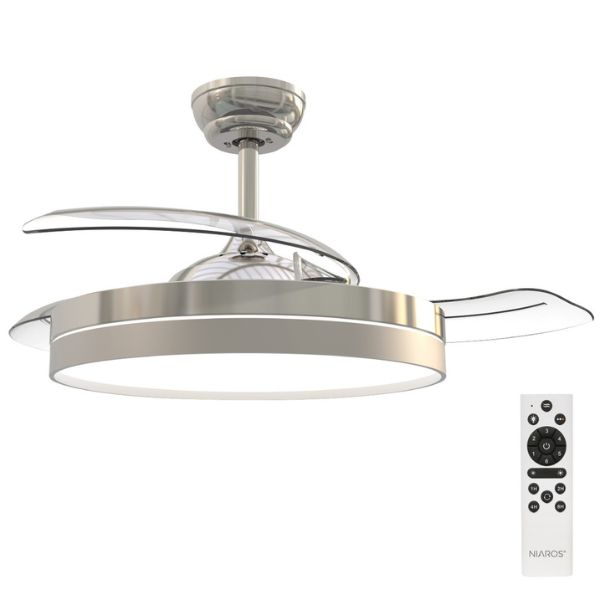 Stropní ventilátor Niaros Lugela s integrovaným LED světlem je moderní a praktické řešení pro obývací pokoj, ložnici nebo pracovnu. Spojuje účinné ochlazování vzduchu, úsporné osvětlení a elegantní design těla přístroje v barvě niklu s průhlednými lopatkami jejichž nenápadný design neruší.