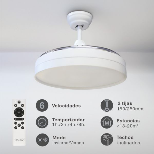 Stropní ventilátor Niaros Lugela s integrovaným LED světlem je moderní a praktické řešení pro obývací pokoj, ložnici nebo pracovnu. Spojuje účinné ochlazování vzduchu, úsporné osvětlení a elegantní design bílého těla přístroje s průhlednými lopatkami jejichž nenápadný design neruší.