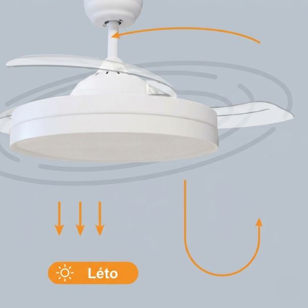 Stropní ventilátor přepnete buď na letní provoz, kdy tlačí vzduch dolů pro chlazení. Anebo zapnete zimní provoz při kterém se změní směr otáčení lopatek a ventilátor bude naopak nasávat vzduch nahoru a smíchávat ho s teplým vzduchem, který se drží u stropu, čímž se rovnoměrněji rozvede teplo po místnosti.