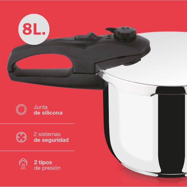 Tlakový hrnec je vybaven třemi bezpečnostními systémy, které zajišťují bezpečné používání při každodenním vaření. O regulaci tlaku se stará gravitační ventil, který automaticky udržuje správnou úroveň tlaku uvnitř hrnce. Můžete si na něm nastavit 2 intenzity upouštění páry