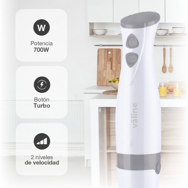 Výkonný elektrický tyčový mixér Väline Kever pro domácí použití má motor o příkonu 700W a disponuje dvěma rychlostmi. Potřebujete-li velký výkon, prostě využijete turborychlost.