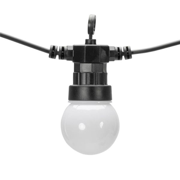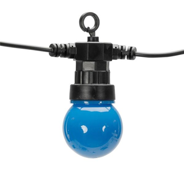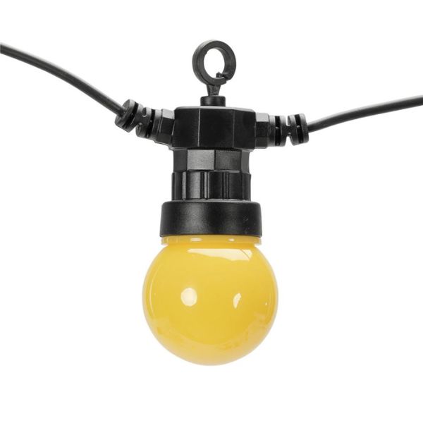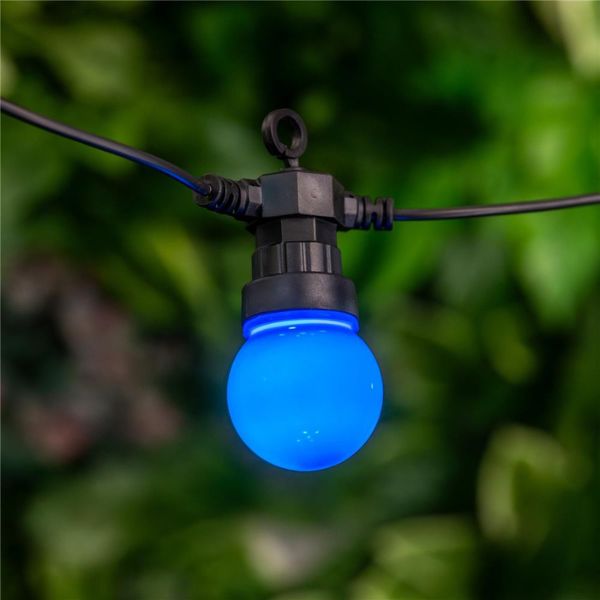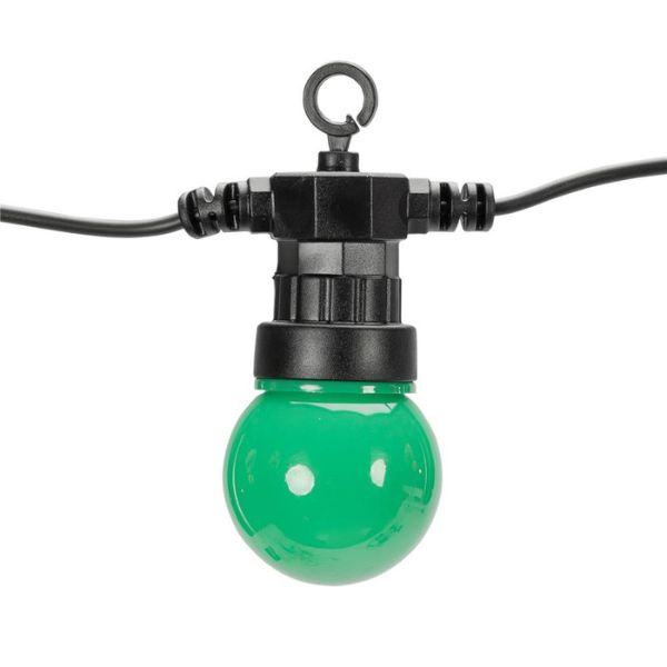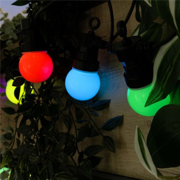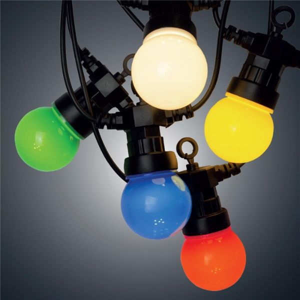 Světelná girlanda se žárovkami o délce 5m + 3m přívodní kabel, určená i pro venkovní použití. Tento venkovní světelný řetěz má 10 integrovaných barevných led žárovek, nemusíte k němu tedy přikupovat žádné světelné zdroje. Led žárovky mají červenou, zelenou, žlutou, bílou a modrou barvu. Led diody v těchto žárovkách svítí teplou, nažloutlou barvou světla, která navozuje klid a pohodu, ovšem barevné kryty žárovek dávají světlu příslušný odstín. Tuto girlandu je možné vzájemně propojovat do celkového počtu 3 stejných řetězů, lze tak vytvořit až 15m dlouhý světelný řetěz + 3m přívodní kabel.