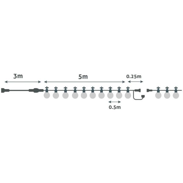 Celková délka světelného řetězu je 8,25m, z toho 3m měří přívodní kabel s koncovkou do zásuvky, 5m je část osazená žárovkami a 0,25m koncovka s možností připojení následujícího řetězu. Rozestupy mezi jednotlivými žárovkami jsou 50cm.
