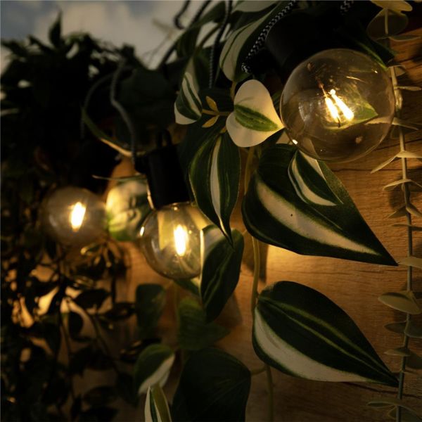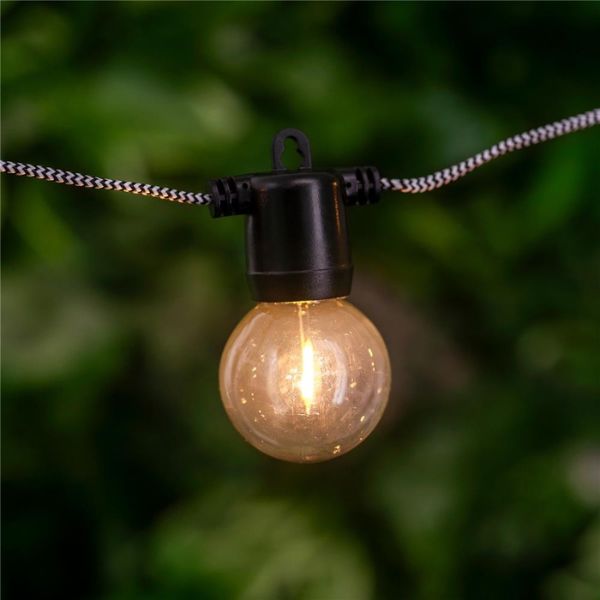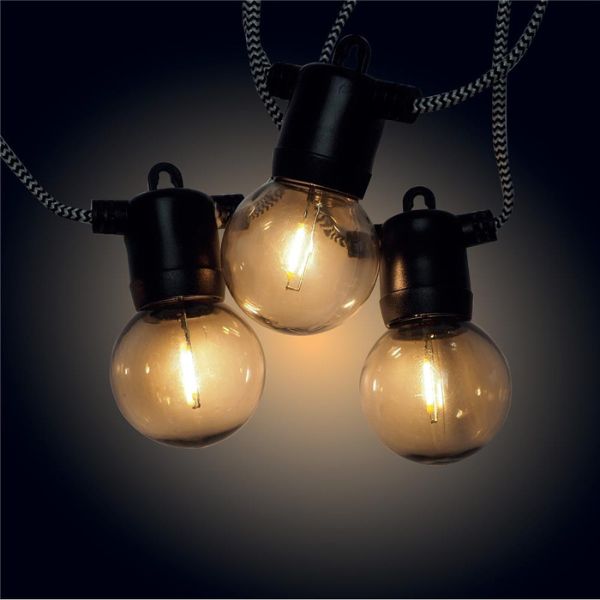 Světelná girlanda se žárovkami o délce 5m + 3m přívodní kabel, určená i pro venkovní použití. Tento venkovní světelný řetěz má 10 integrovaných retro led žárovek, nemusíte k němu tedy přikupovat žádné světelné zdroje. Retro led žárovky mají světelný čip ve tvaru vlákna, svým svitem připomínají klasické vláknové žárovky. Svítí teplou, nažloutlou barvou světla, která navozuje klid a pohodu. Tuto girlandu je možné vzájemně propojovat do celkového počtu 3 stejných řetězů, lze tak vytvořit až 15m dlouhý světelný řetěz + 3m přívodní kabel.