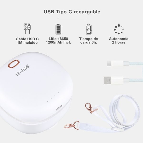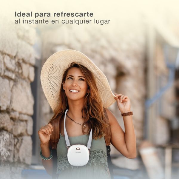 Ventilátor má velmi kompaktní rozměry a nízkou hmotnost, takže jej snadno vezmete kamkoliv s sebou. Ventilátor má na zadní straně sponu, kterou jej můžete připevnit k oblečení. Mnohem efektnější a účelnější je nosit jej zavěšený na krku – díky kombinaci bílé barvy s měděnými prvky vypadá jako designový doplněk a skvěle osvěží. Odnímatelný popruh na krk se stavitelnou délkou je součástí balení.p