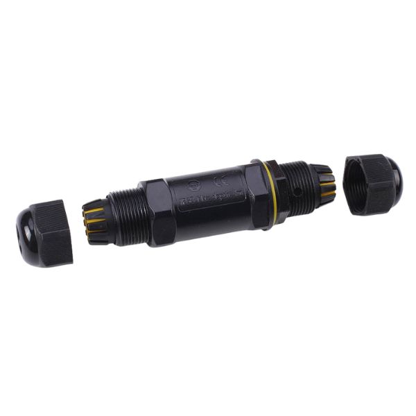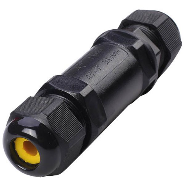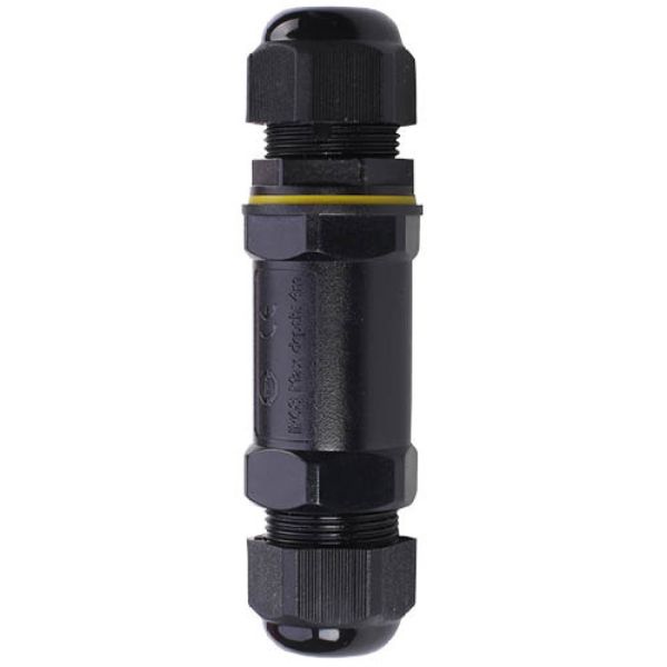 Spojka má válcový tvar s pevnými šroubovacími koncovkami, které zajišťují mechanickou stabilitu a dokonalé utěsnění kabelového spoje. Černé provedení je UV odolné a vhodné pro venkovní použití.