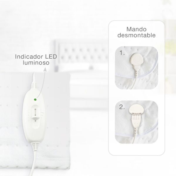 Vyhřívaná podložka je vybavena ochranou proti přehřátí, která zajišťuje bezpečný provoz. Napájecí kabel bílé barvy o délce 2,3 m je odpojitelný, což umožňuje praní podložky na 30°C a snadnou údržbu.