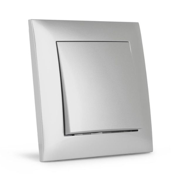 Vypínač má elegantní stříbrnou barvu, rozměry 82x82mm, montážní hloubka 250mm. Vypínač je určený do interiéru, krytí IP20. Jedná se o komplet se strojkem a rámečkem.