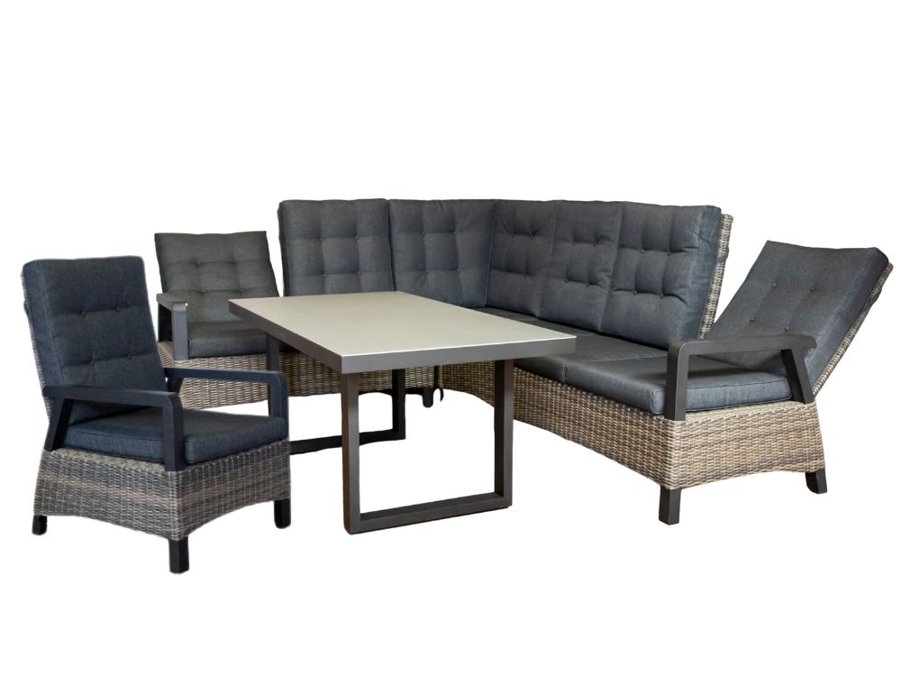 Obě krajní sedadla rohové sedačky jsou polohovatelná, stejně jako křeslo. V područkách je zabudovaný systém podobný zařízení pro sklápění sedadel v letadle. Takže máte-li chuť, můžete si opěradla na těchto 3 místech zahradní sedací soupravy sklopit tak, jak Vám to vyhovuje, a užít si relaxaci.