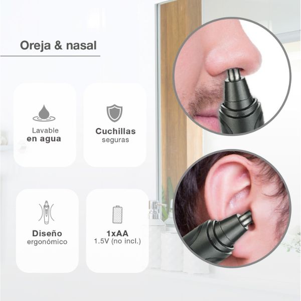 - Bezpečné zastřihování – ideální pro odstraňování chloupků z nosu a uší bez rizika poranění.